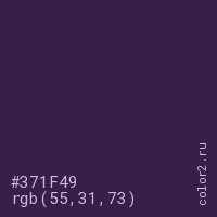 Цвет #371F49 в цветовой модели RGB обозначается тремя октетами (55, 31, 73) в десятичном формате и #371F49 в шестнадцатиричном (hex) формате, которые являются интенсивностью красного 55 (hex 37), интенсивность зелёного 31 (hex 1F) и интенсивность синего 73 (hex 49).
