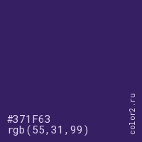 Цвет #371F63 в цветовой модели RGB обозначается тремя октетами (55, 31, 99) в десятичном формате и #371F63 в шестнадцатиричном (hex) формате, которые являются интенсивностью красного 55 (hex 37), интенсивность зелёного 31 (hex 1F) и интенсивность синего 99 (hex 63).