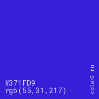 Цвет #371FD9 в цветовой модели RGB обозначается тремя октетами (55, 31, 217) в десятичном формате и #371FD9 в шестнадцатиричном (hex) формате, которые являются интенсивностью красного 55 (hex 37), интенсивность зелёного 31 (hex 1F) и интенсивность синего 217 (hex D9).
