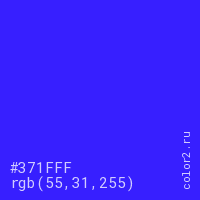 Цвет #371FFF в цветовой модели RGB обозначается тремя октетами (55, 31, 255) в десятичном формате и #371FFF в шестнадцатиричном (hex) формате, которые являются интенсивностью красного 55 (hex 37), интенсивность зелёного 31 (hex 1F) и интенсивность синего 255 (hex FF).