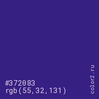 Цвет #372083 в цветовой модели RGB обозначается тремя октетами (55, 32, 131) в десятичном формате и #372083 в шестнадцатиричном (hex) формате, которые являются интенсивностью красного 55 (hex 37), интенсивность зелёного 32 (hex 20) и интенсивность синего 131 (hex 83).