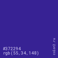 Цвет #372294 в цветовой модели RGB обозначается тремя октетами (55, 34, 148) в десятичном формате и #372294 в шестнадцатиричном (hex) формате, которые являются интенсивностью красного 55 (hex 37), интенсивность зелёного 34 (hex 22) и интенсивность синего 148 (hex 94).