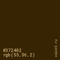 Цвет #372402 в цветовой модели RGB обозначается тремя октетами (55, 36, 2) в десятичном формате и #372402 в шестнадцатиричном (hex) формате, которые являются интенсивностью красного 55 (hex 37), интенсивность зелёного 36 (hex 24) и интенсивность синего 2 (hex 02).