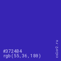 Цвет #3724B4 в цветовой модели RGB обозначается тремя октетами (55, 36, 180) в десятичном формате и #3724B4 в шестнадцатиричном (hex) формате, которые являются интенсивностью красного 55 (hex 37), интенсивность зелёного 36 (hex 24) и интенсивность синего 180 (hex B4).