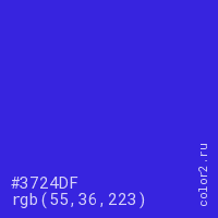Цвет #3724DF в цветовой модели RGB обозначается тремя октетами (55, 36, 223) в десятичном формате и #3724DF в шестнадцатиричном (hex) формате, которые являются интенсивностью красного 55 (hex 37), интенсивность зелёного 36 (hex 24) и интенсивность синего 223 (hex DF).