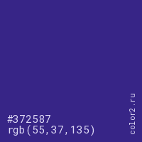 Цвет #372587 в цветовой модели RGB обозначается тремя октетами (55, 37, 135) в десятичном формате и #372587 в шестнадцатиричном (hex) формате, которые являются интенсивностью красного 55 (hex 37), интенсивность зелёного 37 (hex 25) и интенсивность синего 135 (hex 87).