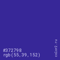 Цвет #372798 в цветовой модели RGB обозначается тремя октетами (55, 39, 152) в десятичном формате и #372798 в шестнадцатиричном (hex) формате, которые являются интенсивностью красного 55 (hex 37), интенсивность зелёного 39 (hex 27) и интенсивность синего 152 (hex 98).