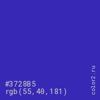 Цвет #3728B5 в цветовой модели RGB обозначается тремя октетами (55, 40, 181) в десятичном формате и #3728B5 в шестнадцатиричном (hex) формате, которые являются интенсивностью красного 55 (hex 37), интенсивность зелёного 40 (hex 28) и интенсивность синего 181 (hex B5).