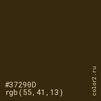 Цвет #37290D в цветовой модели RGB обозначается тремя октетами (55, 41, 13) в десятичном формате и #37290D в шестнадцатиричном (hex) формате, которые являются интенсивностью красного 55 (hex 37), интенсивность зелёного 41 (hex 29) и интенсивность синего 13 (hex 0D).