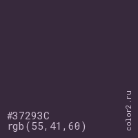 Цвет #37293C в цветовой модели RGB обозначается тремя октетами (55, 41, 60) в десятичном формате и #37293C в шестнадцатиричном (hex) формате, которые являются интенсивностью красного 55 (hex 37), интенсивность зелёного 41 (hex 29) и интенсивность синего 60 (hex 3C).