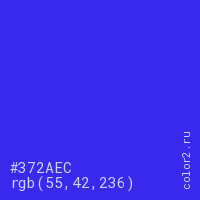 Цвет #372AEC в цветовой модели RGB обозначается тремя октетами (55, 42, 236) в десятичном формате и #372AEC в шестнадцатиричном (hex) формате, которые являются интенсивностью красного 55 (hex 37), интенсивность зелёного 42 (hex 2A) и интенсивность синего 236 (hex EC).