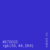 Цвет #372CCC в цветовой модели RGB обозначается тремя октетами (55, 44, 204) в десятичном формате и #372CCC в шестнадцатиричном (hex) формате, которые являются интенсивностью красного 55 (hex 37), интенсивность зелёного 44 (hex 2C) и интенсивность синего 204 (hex CC).