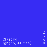 Цвет #372CF4 в цветовой модели RGB обозначается тремя октетами (55, 44, 244) в десятичном формате и #372CF4 в шестнадцатиричном (hex) формате, которые являются интенсивностью красного 55 (hex 37), интенсивность зелёного 44 (hex 2C) и интенсивность синего 244 (hex F4).