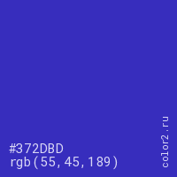 Цвет #372DBD в цветовой модели RGB обозначается тремя октетами (55, 45, 189) в десятичном формате и #372DBD в шестнадцатиричном (hex) формате, которые являются интенсивностью красного 55 (hex 37), интенсивность зелёного 45 (hex 2D) и интенсивность синего 189 (hex BD).