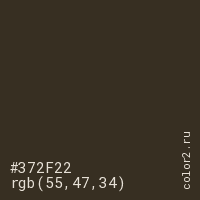 Цвет #372F22 в цветовой модели RGB обозначается тремя октетами (55, 47, 34) в десятичном формате и #372F22 в шестнадцатиричном (hex) формате, которые являются интенсивностью красного 55 (hex 37), интенсивность зелёного 47 (hex 2F) и интенсивность синего 34 (hex 22).