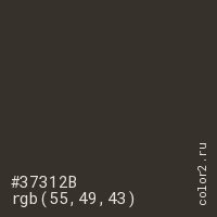 Цвет #37312B в цветовой модели RGB обозначается тремя октетами (55, 49, 43) в десятичном формате и #37312B в шестнадцатиричном (hex) формате, которые являются интенсивностью красного 55 (hex 37), интенсивность зелёного 49 (hex 31) и интенсивность синего 43 (hex 2B).