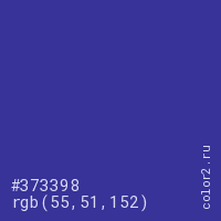 Цвет #373398 в цветовой модели RGB обозначается тремя октетами (55, 51, 152) в десятичном формате и #373398 в шестнадцатиричном (hex) формате, которые являются интенсивностью красного 55 (hex 37), интенсивность зелёного 51 (hex 33) и интенсивность синего 152 (hex 98).