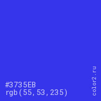 Цвет #3735EB в цветовой модели RGB обозначается тремя октетами (55, 53, 235) в десятичном формате и #3735EB в шестнадцатиричном (hex) формате, которые являются интенсивностью красного 55 (hex 37), интенсивность зелёного 53 (hex 35) и интенсивность синего 235 (hex EB).