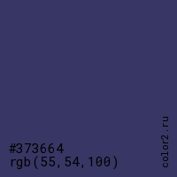 Цвет #373664 в цветовой модели RGB обозначается тремя октетами (55, 54, 100) в десятичном формате и #373664 в шестнадцатиричном (hex) формате, которые являются интенсивностью красного 55 (hex 37), интенсивность зелёного 54 (hex 36) и интенсивность синего 100 (hex 64).