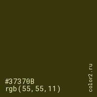 Цвет #37370B в цветовой модели RGB обозначается тремя октетами (55, 55, 11) в десятичном формате и #37370B в шестнадцатиричном (hex) формате, которые являются интенсивностью красного 55 (hex 37), интенсивность зелёного 55 (hex 37) и интенсивность синего 11 (hex 0B).