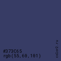 Цвет #373C65 в цветовой модели RGB обозначается тремя октетами (55, 60, 101) в десятичном формате и #373C65 в шестнадцатиричном (hex) формате, которые являются интенсивностью красного 55 (hex 37), интенсивность зелёного 60 (hex 3C) и интенсивность синего 101 (hex 65).