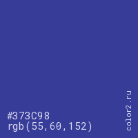 Цвет #373C98 в цветовой модели RGB обозначается тремя октетами (55, 60, 152) в десятичном формате и #373C98 в шестнадцатиричном (hex) формате, которые являются интенсивностью красного 55 (hex 37), интенсивность зелёного 60 (hex 3C) и интенсивность синего 152 (hex 98).