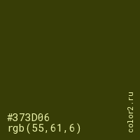 Цвет #373D06 в цветовой модели RGB обозначается тремя октетами (55, 61, 6) в десятичном формате и #373D06 в шестнадцатиричном (hex) формате, которые являются интенсивностью красного 55 (hex 37), интенсивность зелёного 61 (hex 3D) и интенсивность синего 6 (hex 06).