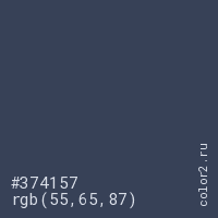 Цвет #374157 в цветовой модели RGB обозначается тремя октетами (55, 65, 87) в десятичном формате и #374157 в шестнадцатиричном (hex) формате, которые являются интенсивностью красного 55 (hex 37), интенсивность зелёного 65 (hex 41) и интенсивность синего 87 (hex 57).