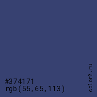 Цвет #374171 в цветовой модели RGB обозначается тремя октетами (55, 65, 113) в десятичном формате и #374171 в шестнадцатиричном (hex) формате, которые являются интенсивностью красного 55 (hex 37), интенсивность зелёного 65 (hex 41) и интенсивность синего 113 (hex 71).