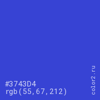 Цвет #3743D4 в цветовой модели RGB обозначается тремя октетами (55, 67, 212) в десятичном формате и #3743D4 в шестнадцатиричном (hex) формате, которые являются интенсивностью красного 55 (hex 37), интенсивность зелёного 67 (hex 43) и интенсивность синего 212 (hex D4).