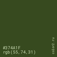 Цвет #374A1F в цветовой модели RGB обозначается тремя октетами (55, 74, 31) в десятичном формате и #374A1F в шестнадцатиричном (hex) формате, которые являются интенсивностью красного 55 (hex 37), интенсивность зелёного 74 (hex 4A) и интенсивность синего 31 (hex 1F).