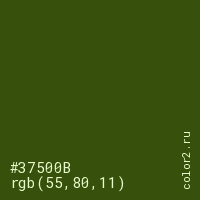 Цвет #37500B в цветовой модели RGB обозначается тремя октетами (55, 80, 11) в десятичном формате и #37500B в шестнадцатиричном (hex) формате, которые являются интенсивностью красного 55 (hex 37), интенсивность зелёного 80 (hex 50) и интенсивность синего 11 (hex 0B).