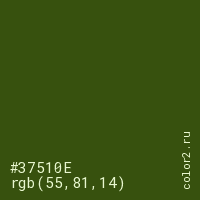 Цвет #37510E в цветовой модели RGB обозначается тремя октетами (55, 81, 14) в десятичном формате и #37510E в шестнадцатиричном (hex) формате, которые являются интенсивностью красного 55 (hex 37), интенсивность зелёного 81 (hex 51) и интенсивность синего 14 (hex 0E).