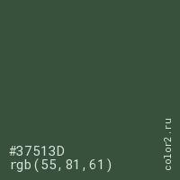 Цвет #37513D в цветовой модели RGB обозначается тремя октетами (55, 81, 61) в десятичном формате и #37513D в шестнадцатиричном (hex) формате, которые являются интенсивностью красного 55 (hex 37), интенсивность зелёного 81 (hex 51) и интенсивность синего 61 (hex 3D).