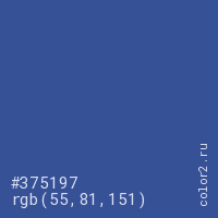 Цвет #375197 в цветовой модели RGB обозначается тремя октетами (55, 81, 151) в десятичном формате и #375197 в шестнадцатиричном (hex) формате, которые являются интенсивностью красного 55 (hex 37), интенсивность зелёного 81 (hex 51) и интенсивность синего 151 (hex 97).