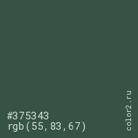 Цвет #375343 в цветовой модели RGB обозначается тремя октетами (55, 83, 67) в десятичном формате и #375343 в шестнадцатиричном (hex) формате, которые являются интенсивностью красного 55 (hex 37), интенсивность зелёного 83 (hex 53) и интенсивность синего 67 (hex 43).