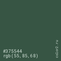Цвет #375544 в цветовой модели RGB обозначается тремя октетами (55, 85, 68) в десятичном формате и #375544 в шестнадцатиричном (hex) формате, которые являются интенсивностью красного 55 (hex 37), интенсивность зелёного 85 (hex 55) и интенсивность синего 68 (hex 44).
