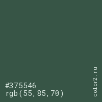 Цвет #375546 в цветовой модели RGB обозначается тремя октетами (55, 85, 70) в десятичном формате и #375546 в шестнадцатиричном (hex) формате, которые являются интенсивностью красного 55 (hex 37), интенсивность зелёного 85 (hex 55) и интенсивность синего 70 (hex 46).