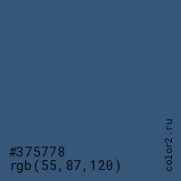 Цвет #375778 в цветовой модели RGB обозначается тремя октетами (55, 87, 120) в десятичном формате и #375778 в шестнадцатиричном (hex) формате, которые являются интенсивностью красного 55 (hex 37), интенсивность зелёного 87 (hex 57) и интенсивность синего 120 (hex 78).