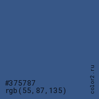 Цвет #375787 в цветовой модели RGB обозначается тремя октетами (55, 87, 135) в десятичном формате и #375787 в шестнадцатиричном (hex) формате, которые являются интенсивностью красного 55 (hex 37), интенсивность зелёного 87 (hex 57) и интенсивность синего 135 (hex 87).