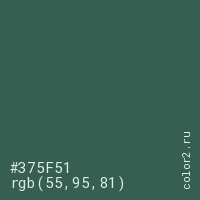 Цвет #375F51 в цветовой модели RGB обозначается тремя октетами (55, 95, 81) в десятичном формате и #375F51 в шестнадцатиричном (hex) формате, которые являются интенсивностью красного 55 (hex 37), интенсивность зелёного 95 (hex 5F) и интенсивность синего 81 (hex 51).