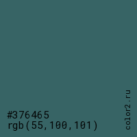 Цвет #376465 в цветовой модели RGB обозначается тремя октетами (55, 100, 101) в десятичном формате и #376465 в шестнадцатиричном (hex) формате, которые являются интенсивностью красного 55 (hex 37), интенсивность зелёного 100 (hex 64) и интенсивность синего 101 (hex 65).