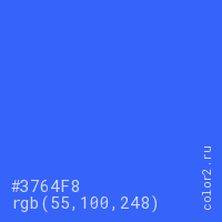 Цвет #3764F8 в цветовой модели RGB обозначается тремя октетами (55, 100, 248) в десятичном формате и #3764F8 в шестнадцатиричном (hex) формате, которые являются интенсивностью красного 55 (hex 37), интенсивность зелёного 100 (hex 64) и интенсивность синего 248 (hex F8).