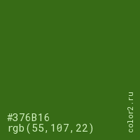 Цвет #376B16 в цветовой модели RGB обозначается тремя октетами (55, 107, 22) в десятичном формате и #376B16 в шестнадцатиричном (hex) формате, которые являются интенсивностью красного 55 (hex 37), интенсивность зелёного 107 (hex 6B) и интенсивность синего 22 (hex 16).