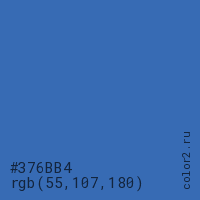 Цвет #376BB4 в цветовой модели RGB обозначается тремя октетами (55, 107, 180) в десятичном формате и #376BB4 в шестнадцатиричном (hex) формате, которые являются интенсивностью красного 55 (hex 37), интенсивность зелёного 107 (hex 6B) и интенсивность синего 180 (hex B4).