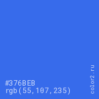 Цвет #376BEB в цветовой модели RGB обозначается тремя октетами (55, 107, 235) в десятичном формате и #376BEB в шестнадцатиричном (hex) формате, которые являются интенсивностью красного 55 (hex 37), интенсивность зелёного 107 (hex 6B) и интенсивность синего 235 (hex EB).