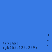 Цвет #377AE5 в цветовой модели RGB обозначается тремя октетами (55, 122, 229) в десятичном формате и #377AE5 в шестнадцатиричном (hex) формате, которые являются интенсивностью красного 55 (hex 37), интенсивность зелёного 122 (hex 7A) и интенсивность синего 229 (hex E5).
