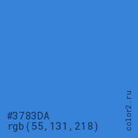 Цвет #3783DA в цветовой модели RGB обозначается тремя октетами (55, 131, 218) в десятичном формате и #3783DA в шестнадцатиричном (hex) формате, которые являются интенсивностью красного 55 (hex 37), интенсивность зелёного 131 (hex 83) и интенсивность синего 218 (hex DA).