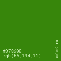 Цвет #37860B в цветовой модели RGB обозначается тремя октетами (55, 134, 11) в десятичном формате и #37860B в шестнадцатиричном (hex) формате, которые являются интенсивностью красного 55 (hex 37), интенсивность зелёного 134 (hex 86) и интенсивность синего 11 (hex 0B).