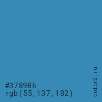 Цвет #3789B6 в цветовой модели RGB обозначается тремя октетами (55, 137, 182) в десятичном формате и #3789B6 в шестнадцатиричном (hex) формате, которые являются интенсивностью красного 55 (hex 37), интенсивность зелёного 137 (hex 89) и интенсивность синего 182 (hex B6).